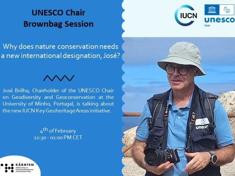| | | | José Brilha, docente do Departamento de Ciências da Terra e coordenador da Cátedra UNESCO em Geodiversidade e Geoconservação, participou no passado dia 4 de fevereiro num webinar organizado pela Cátedra UNESCO em Gestão Sustentável de Áreas de Conservação da Carinthia University of Applied Sciences (Áustria). | | |